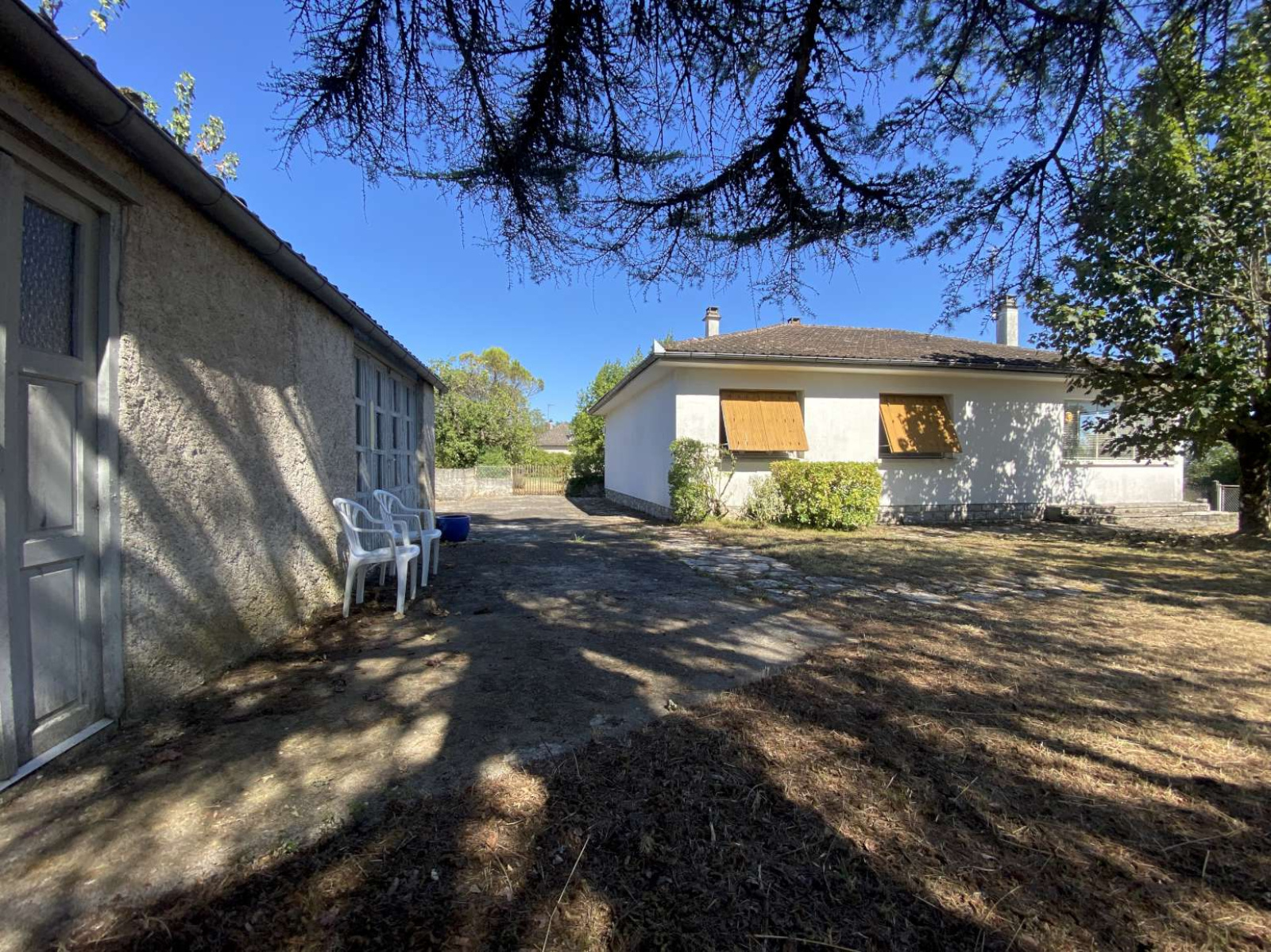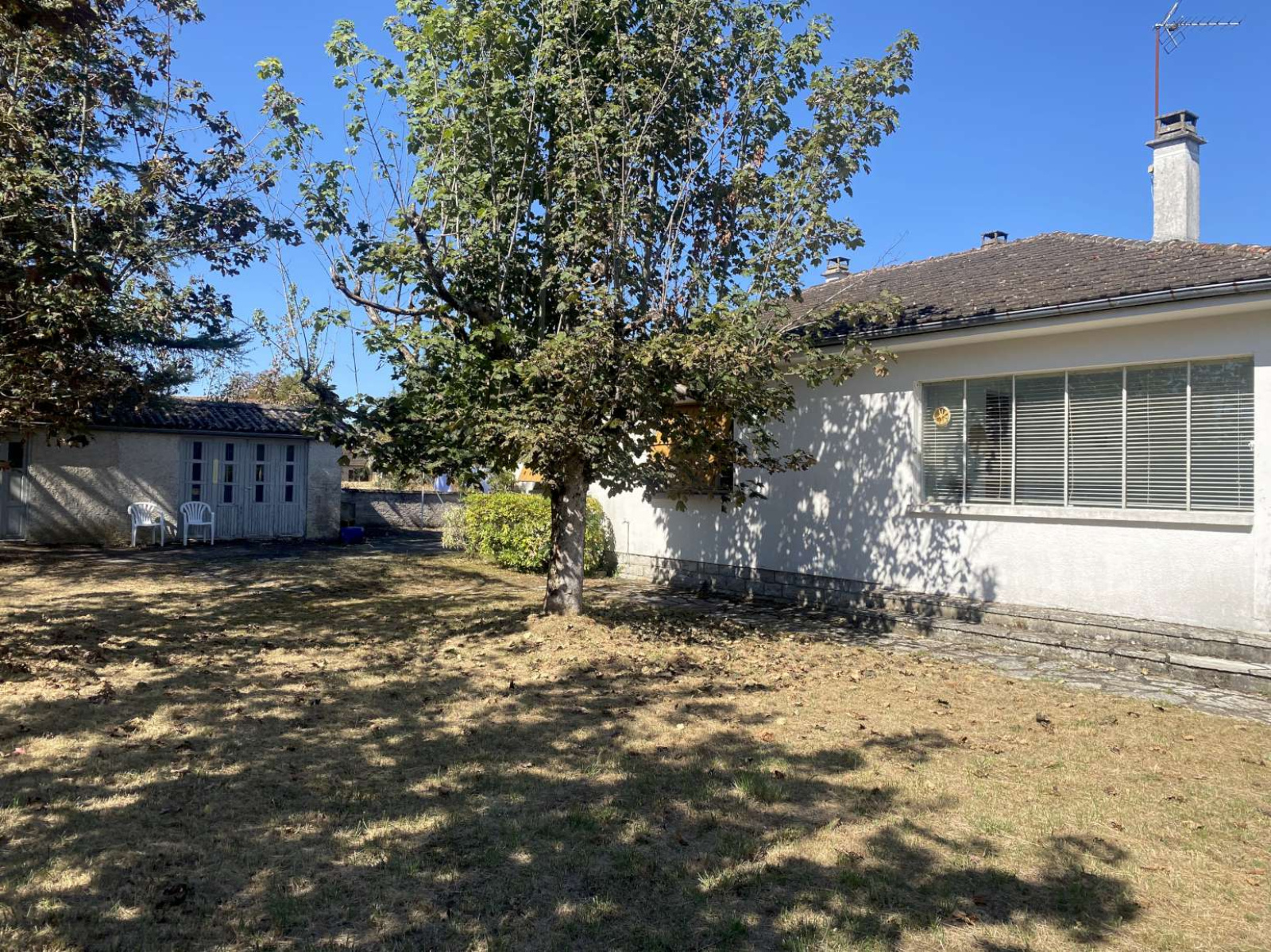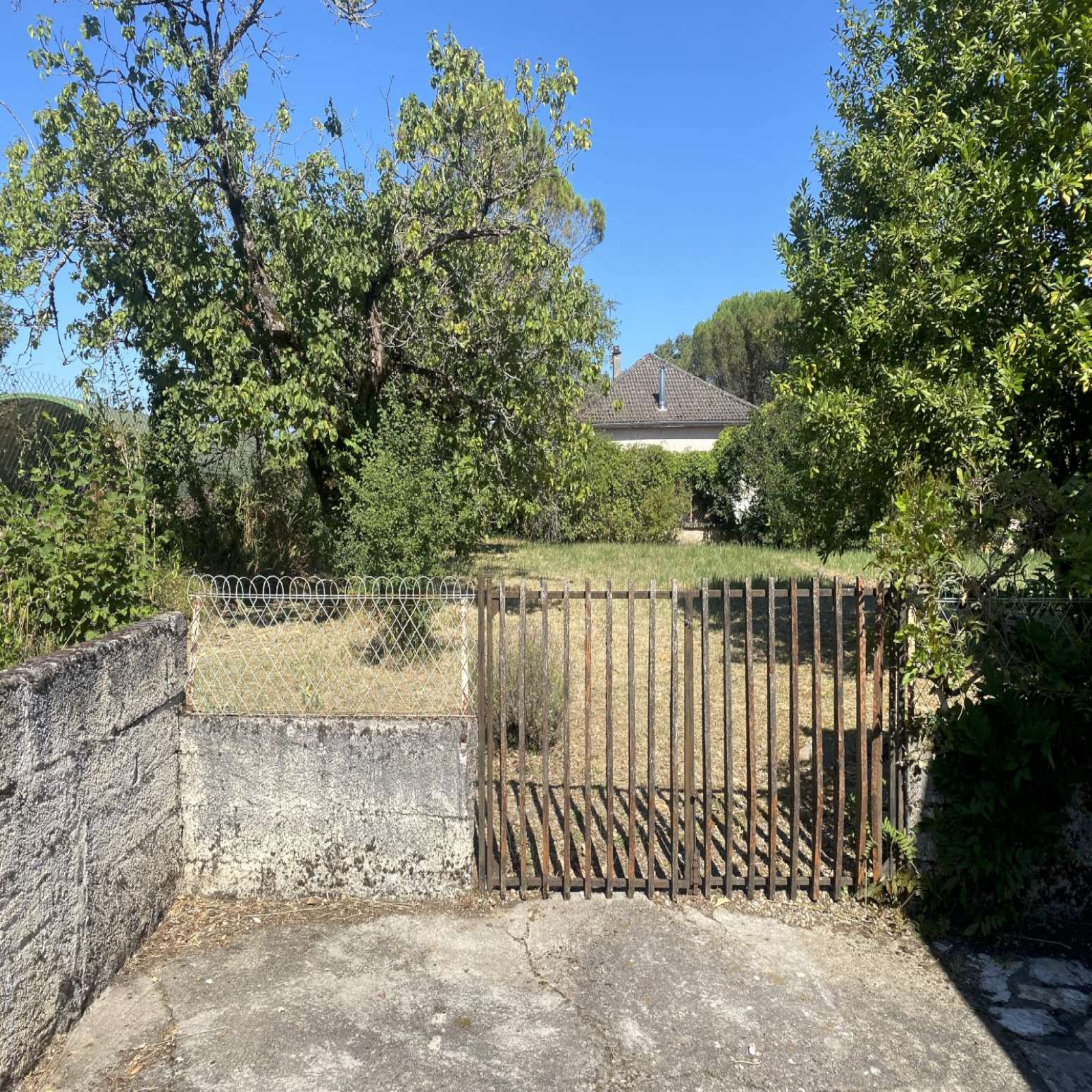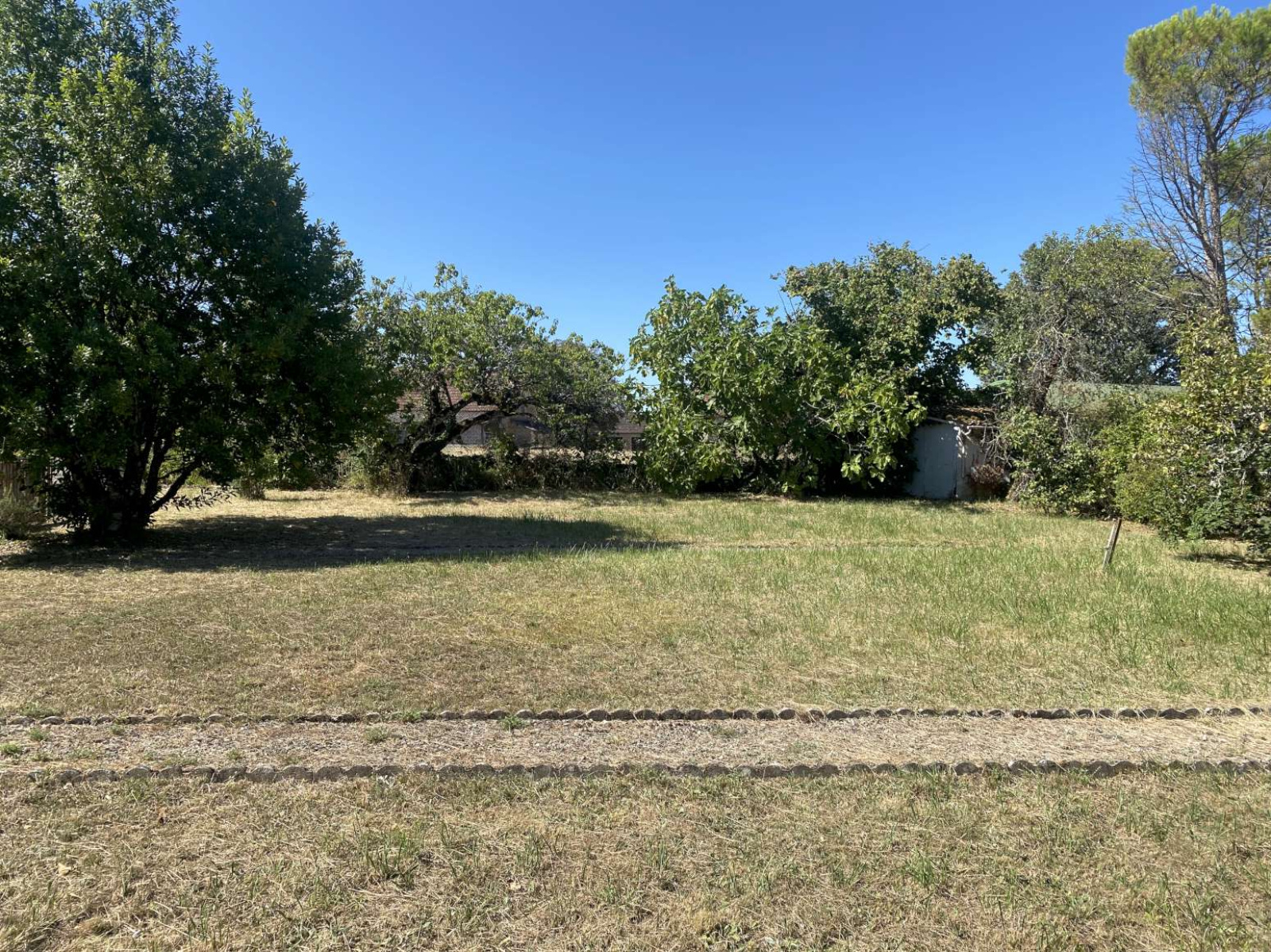 Jardin en 2 parties : petit terre-plein arboré (sapin, érables) ~300m² + verger (pruniers, cerisier, figuier...) 600m².