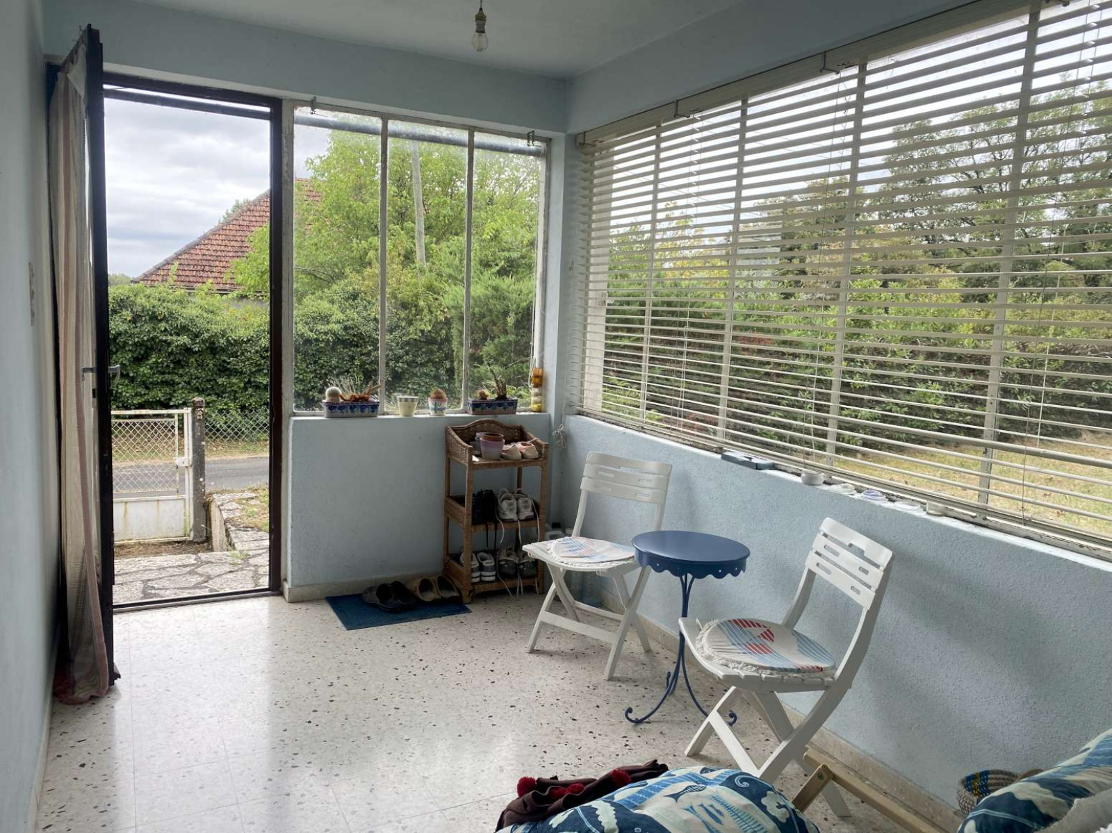 La maison (RDC sur vide sanitaire, accessible par 2 marches) : entrée vitrée faisant office de véranda 8m², salon – salle à manger 22,50m², cuisine 9,50m², chambre 13,50m², 2e chambre 12,50m², salle d'eau 5m², WC 1,3m², buanderie / chaufferie 9m², couloir desservant l'ensemble des pièces 17,25m².