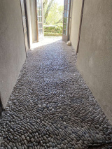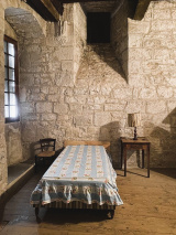 Le « rez-de-chaussée haut » de la tour (1er niveau au-dessus de la cave voûtée) contient 3 chambres de 10m², 15m² et 16,5m², desservies par une entrée avec un très joli pisé au sol, donnant à la fois vers l'escalier de la tour et la pièce à vivre du logis. Celle-ci est prolongée par une petite extension récente, en pierre, contenant des sanitaires (salle de bain et WC).