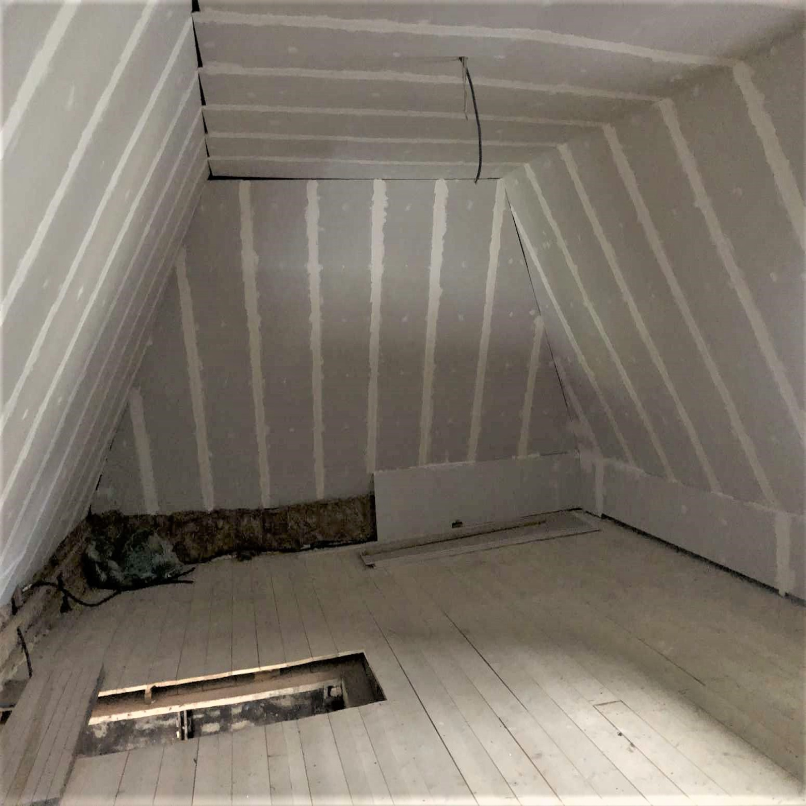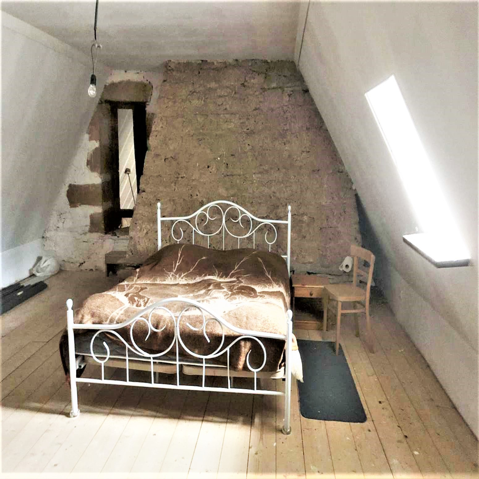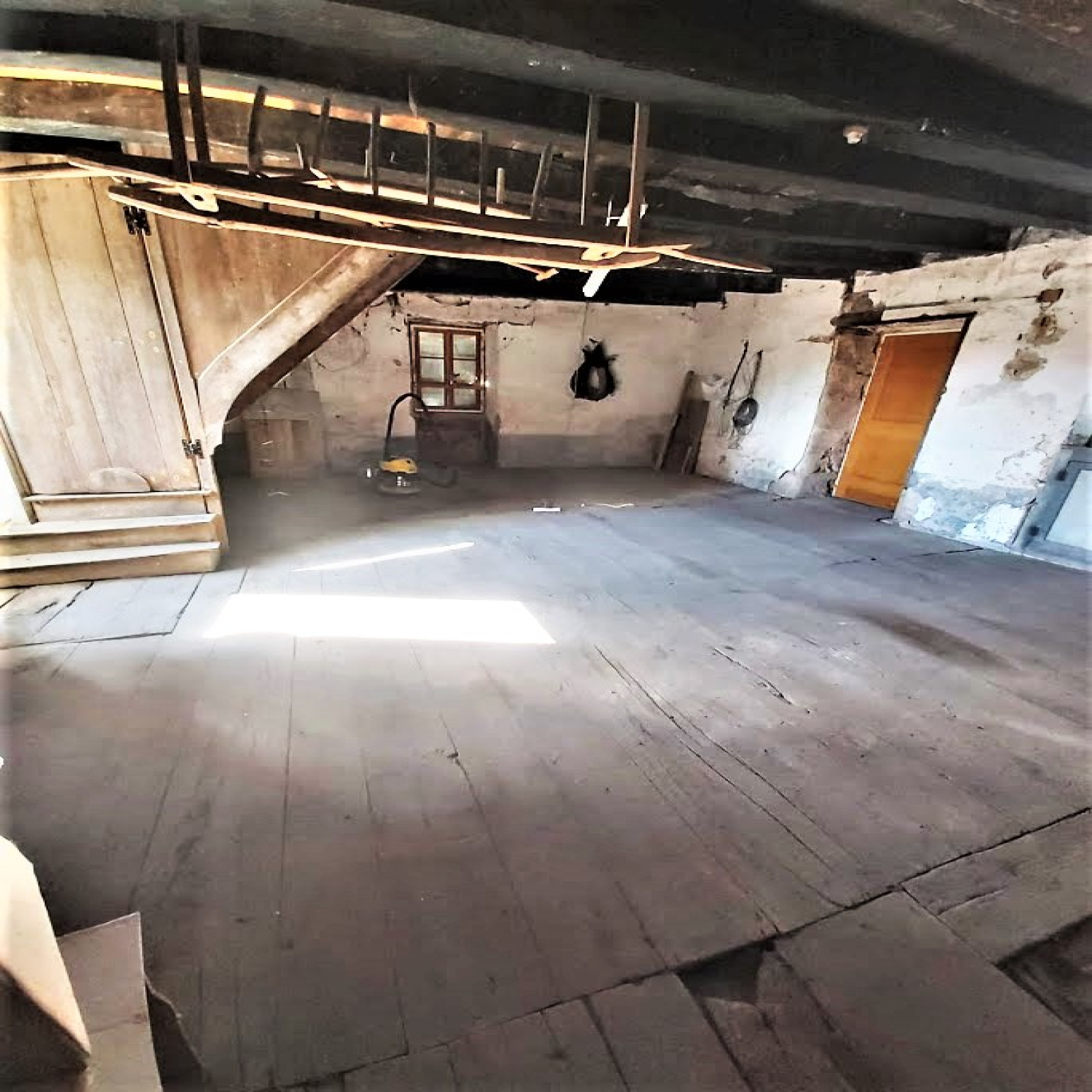 A l'étage (~80m² au sol, 50m² utiles) : 2 chambres aménagées dans les combles, petit cabinet de toilettes.