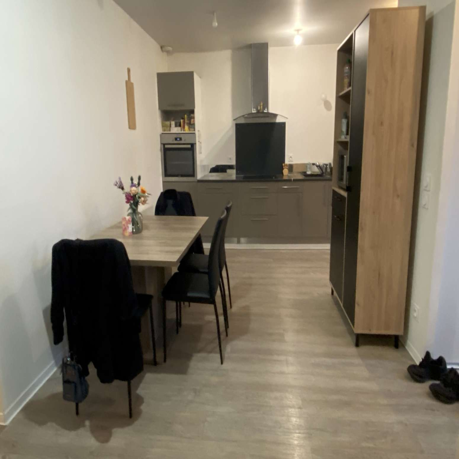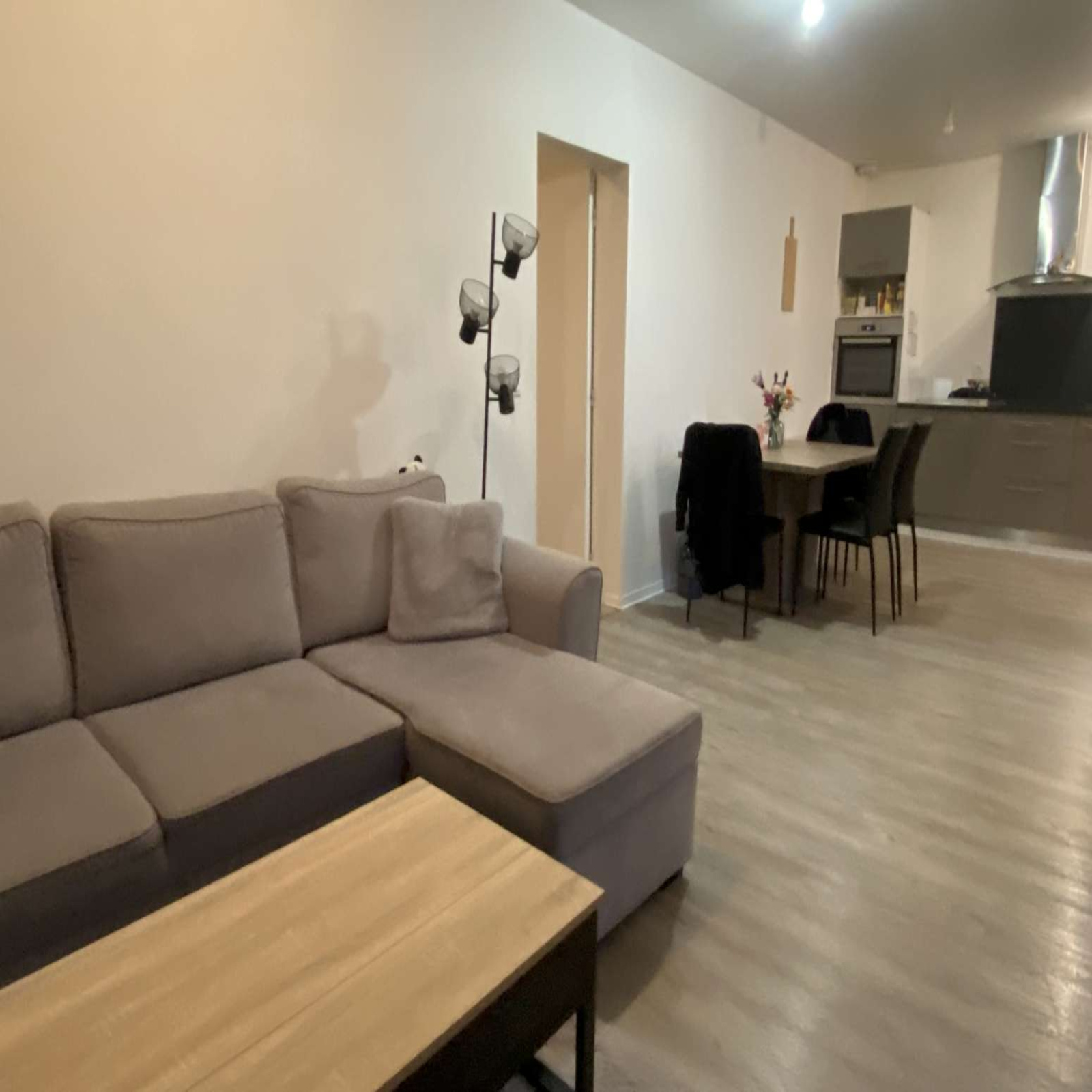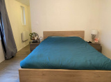 Appartement 1e étage (89m²), entrée en RDC, escalier conduisant à l'entrée de l'appartement s'ouvrant sur une pièce à vivre avec cuisine ouverte, 3 chambres, salle d'eau avec douche à l'italienne refaite...