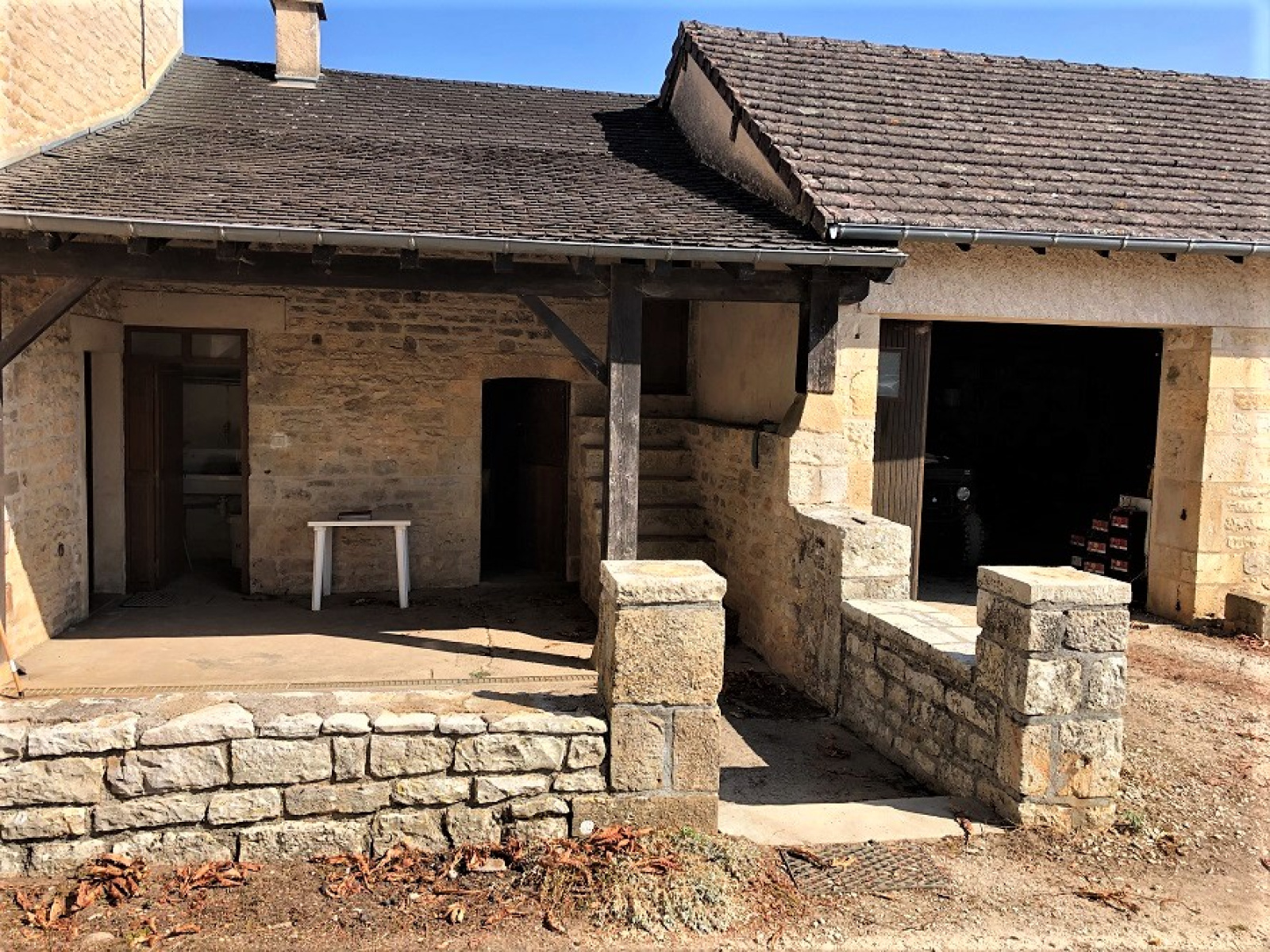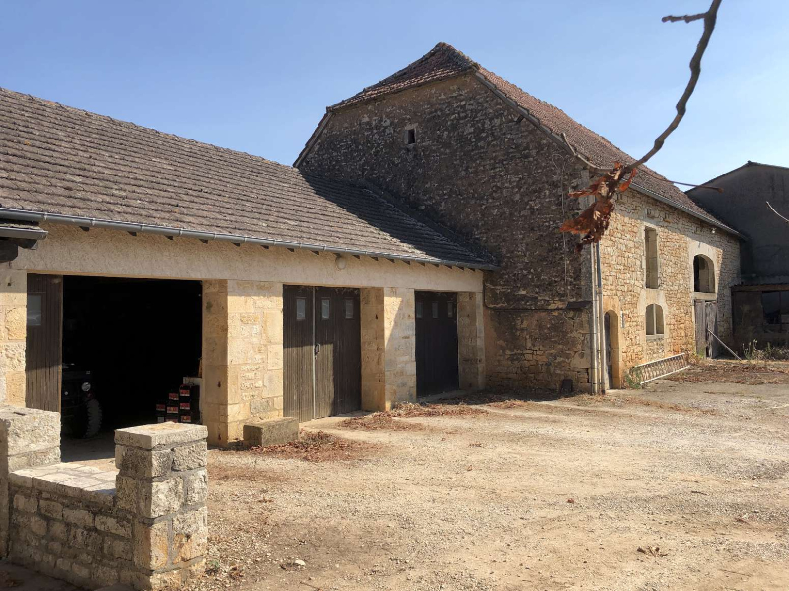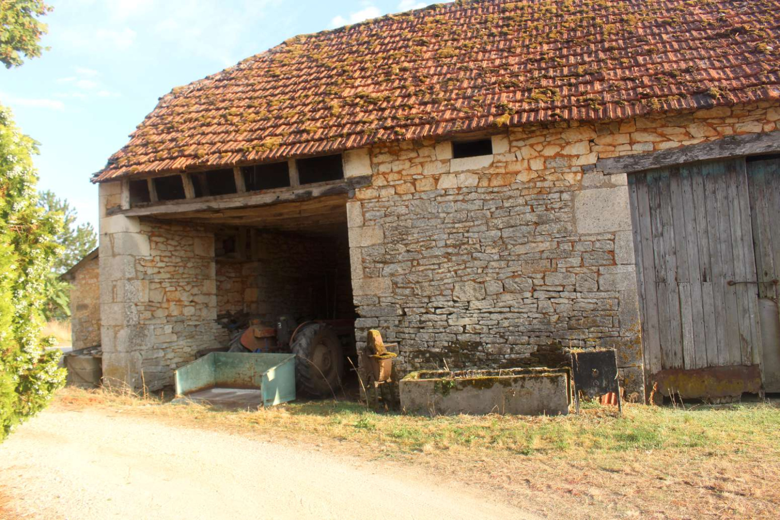 Grande grange pierre 100m² au sol, partie garage tracteurs attenante, hangar parpaing en appentis.