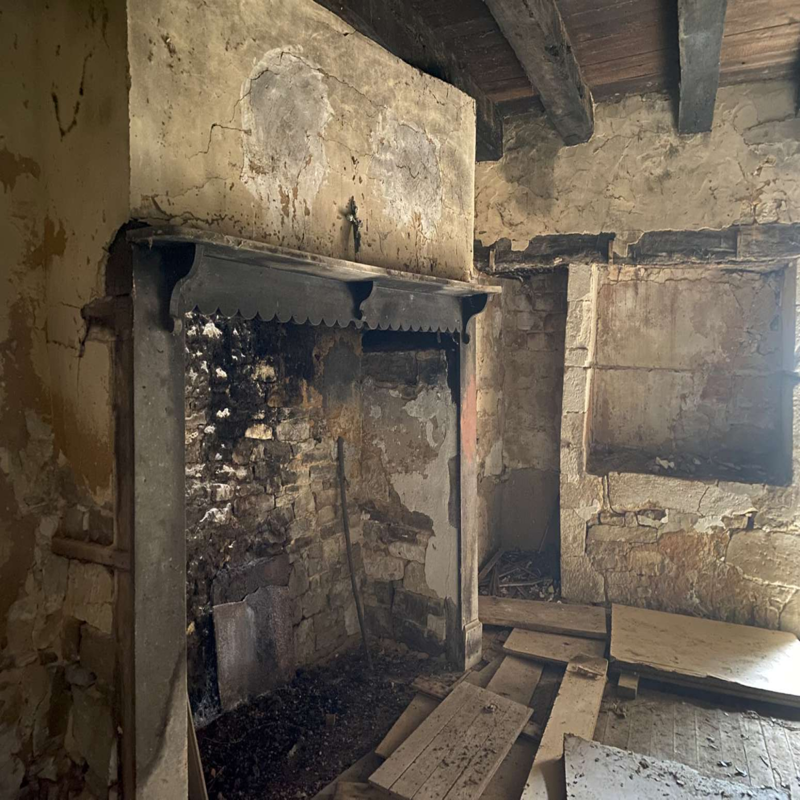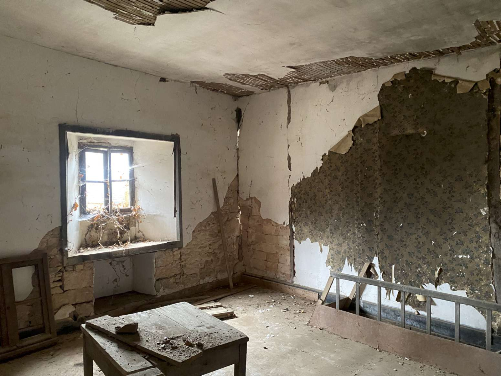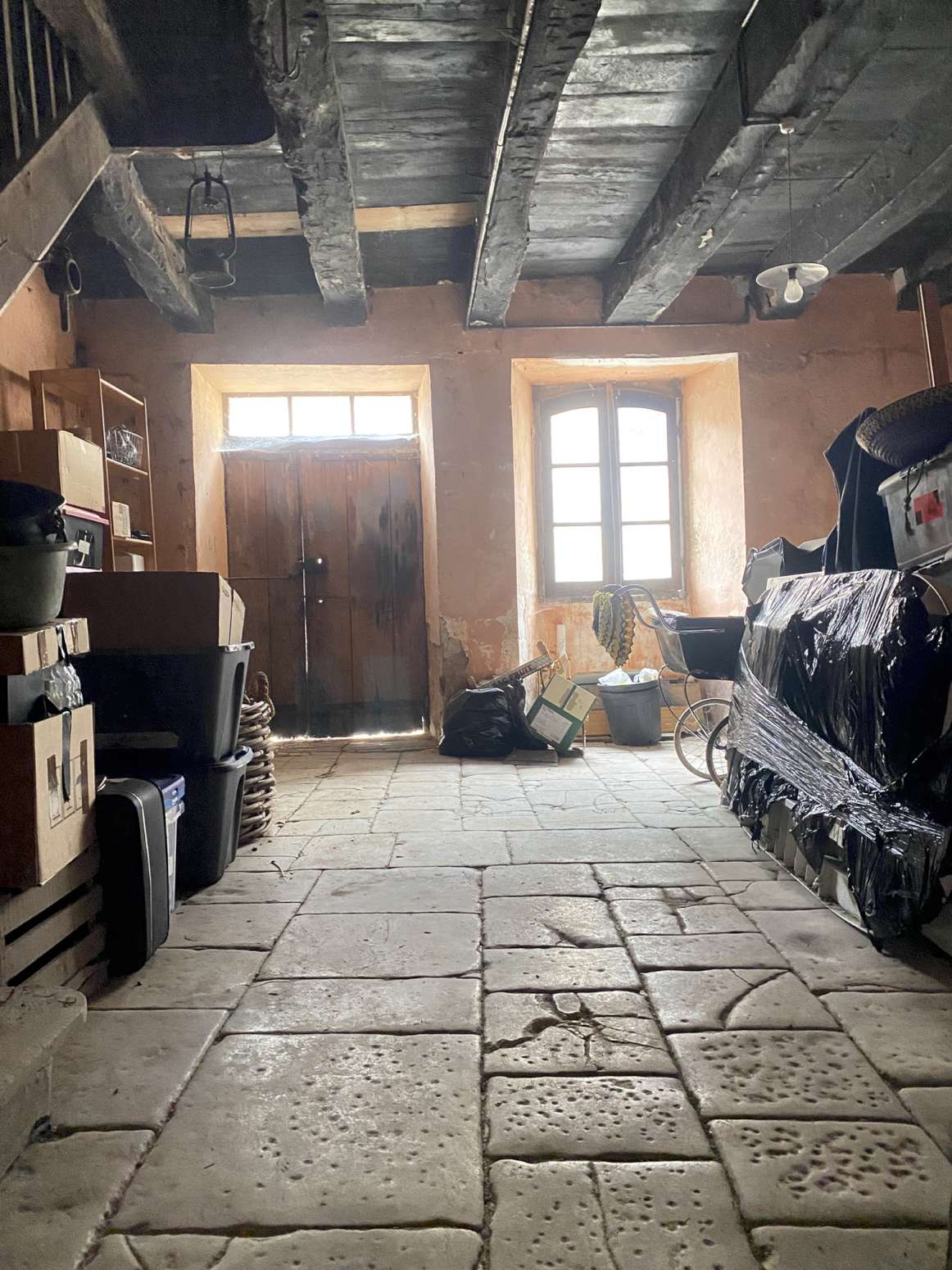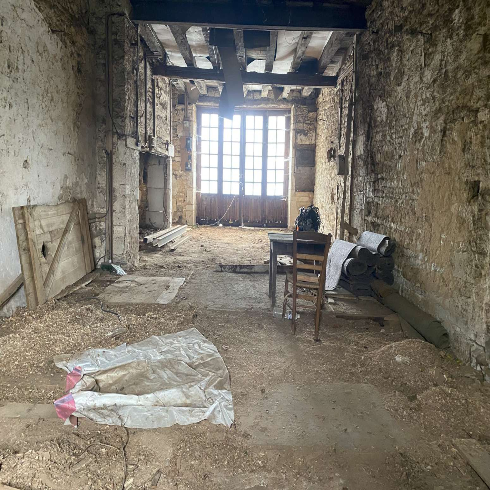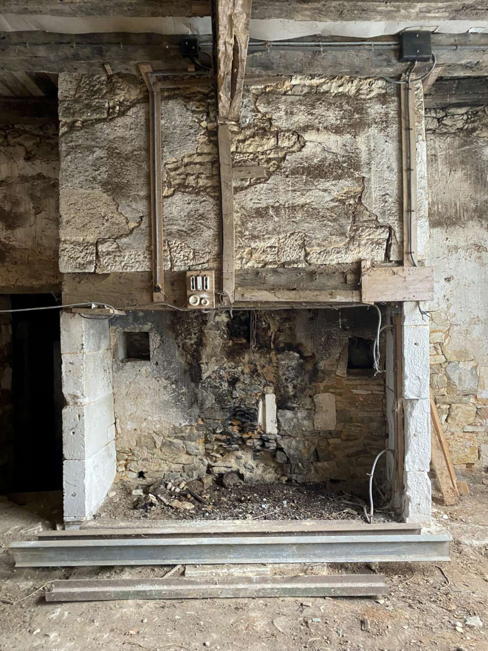 En RDC = pièce à vivre avec cheminée et dalles de pierre au sol de 29m² ; couloir 6,5m² ; 2e pièce de 19m²,
